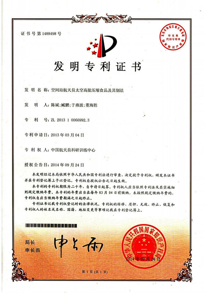 神舟太空食物高科技(深圳)无限公司独家具有中国航天员科研锻炼核心的空间坐航天员食物专利手艺——《空间坐航天员高能压缩食物及其制法》,专利号为ZL2。3。这一空间坐航天员食物专利手艺,使其正在市场所作中占领绝对劣势地位。