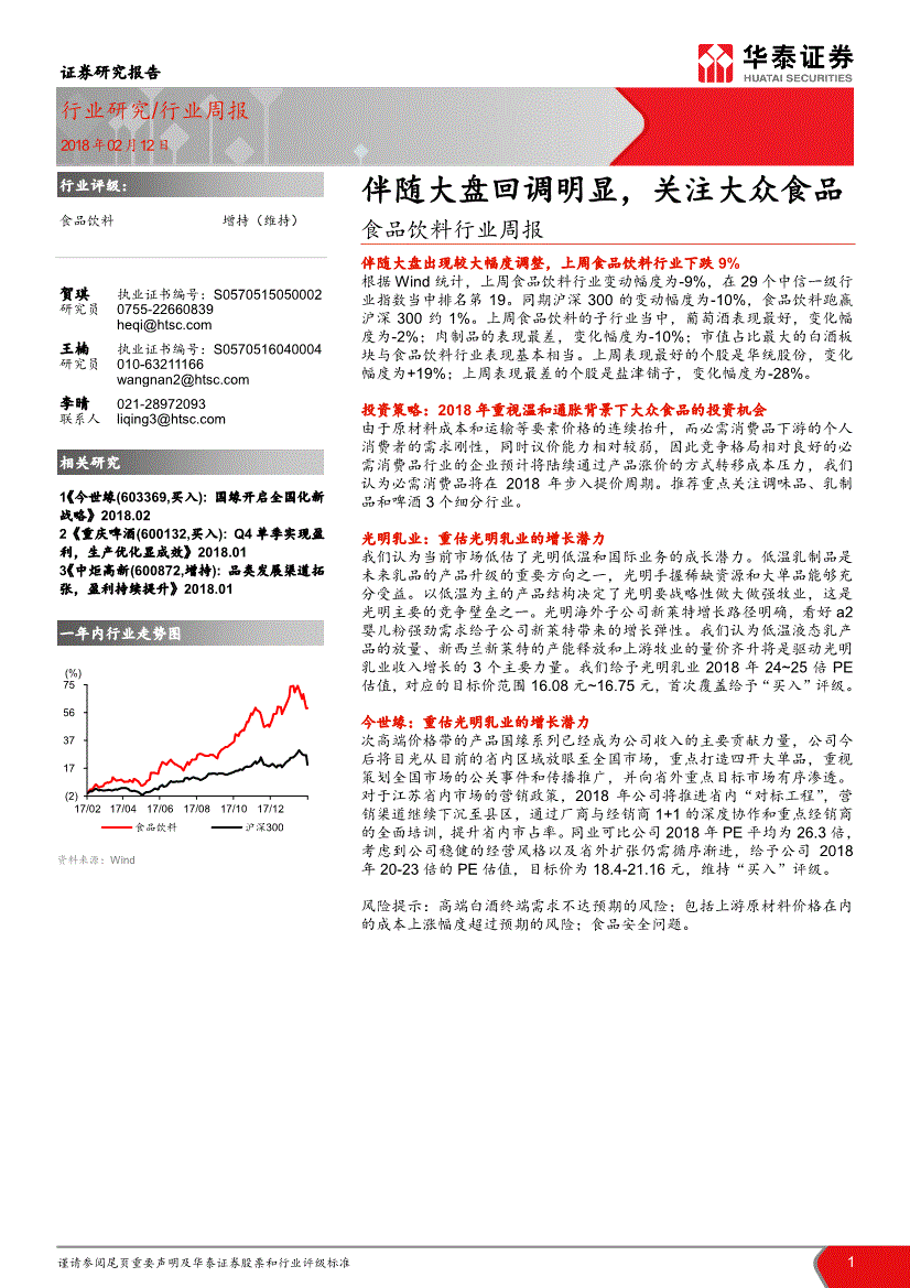 行业研究演讲1 证券研究演讲行业研究/行业周报2018年02月12日 食物饮料增持(维持) 贺琪执业证书编号:S02 研究员 王楠执业证书编号:S04 研究员 李晴 联系人 1《当代缘(603369,买入)!国缘全国化新计谋》2018。02 2《沉庆啤酒(600132,买入)! Q4单季实现盈利,出产优化显成效》2018。01 3《中炬高新(600872,增持)!品类成长渠道拓张,盈利持续提拔》2018。01 材料来历:Wind 陪伴大盘回调较着,关心公共食物食物饮料行业周报陪伴大盘呈现较大幅度调整,上周食物饮料行业下跌9% 按照Wind统计,上周食物饮料行业变更幅度为-9%,正在29个中信一级行业指数傍边排名第19。上周食物饮料的子行业傍边,葡萄酒表示最好,变化幅度为-2%;肉成品的表示最差,变化幅度为-10%;市值占比最大的白酒板块取食物饮料行业表示根基相当。上周表示最好的个股是华统股份,变化幅度为+19%;上周表示最差的个股是盐津铺子,变化幅度为-28%。投资策略:2018年注沉暖和通缩布景下公共食物的投资机遇因为原材料成本和运输等要素价钱的持续抬升,而必需消费品下逛的小我消费者的需求刚性,因而合作款式相对优良的必需消费操行业的企业估计将连续通过产物跌价的体例转移成本压力,我们认为必需消费品将正在2018年步入提价周期。我们认为低温液态乳产物的放量、新莱特的产能和上逛牧业的量价齐升将是驱动乳业收入增加的3个次要力量。我们赐与乳业2018年24~25倍PE估值,对应的方针价范畴16。08元~16。75元,初次笼盖赐与“买入”评级。当代缘:沉估乳业的增加潜力次高端价钱带的产物国缘系列曾经成为公司收入的次要贡献力量,公司此后将目光从目前的省内区域放眼至全国市场,沉点打制四开大单品,注沉筹谋全国市场的公关事务和推广,并向省外沉点方针市场有序渗入。对于江苏省内市场的营销政策,2018年公司将推进省内“对标工程”,营销渠道继续下沉至县区,通过厂商取经销商1+1的深度协做和沉点经销商的全面培训,提拔省内市占率。同业可比公司2018年PE平均为26。3倍,考虑到公司稳健的运营气概以及省外扩张仍需循序渐进,赐与公司2018年20-23倍的PE估值,方针价为18。4-21。16元,维持“买入”评级。风险提醒:高端白酒终端需求不达预期的风险;包罗上逛原材料价钱正在内的成本上涨幅度跨越预期的风险;食物平安问题。因为原材料成本和运输等要素价钱的持续抬升,而必需消费品下逛的小我消费者的需求刚性,同时议价能力相对较弱,因而合作款式相对优良的必需消费操行业的企业估计将连续通过产物跌价的体例转移成本压力,我们认为必需消费品将正在2018年步入提价周期。1)餐饮业16年下半年起头回暖,商务勾当和中低端餐饮均有较为较着的苏醒迹象,利好调味品板块。同时,2016年12月海天颁布发表提价之后,2017年3月中炬颁布发表出厂价提拔5%,终端提价8%,2017年板块呈现量价齐升行情。2017年海天市占率不到20%,中炬仅为5%摆布,而日本调味品巨头龟甲万市占率可达30%,市占率有较着差距。中国调味操行业正处于集中度快速提拔阶段,将来龙头正在规模效应、品类拓张以及渠道掌控力等多方面都将持续劣势,增加空间较大。1)本轮液态乳的需求回暖的本色是:宏不雅转好的布景下,由低线城市需求拉动的包罗乳成品正在内的消费市场的回暖。原奶的价钱正在供给端持续收缩,需求端景气宇回升较着的布景下将步入上行通道,原奶价钱上升周期里,行业龙头倾向于成本上升对利润的影响,削减费用投放,因而利润程度将获得提拔。履历了价钱和和市场份额的掠取,部门区域正正在构成强势企业垄断的市场款式,将来啤酒行业将加快产物布局升级和利润。2) 2018年1月以华润啤酒为代表的行业次要参取者颁布发表上调部门产物价钱,标记着行业步入了价钱上行周期。此外,2014-2016年间啤酒行业产物升级较着,中档酒占比快速提拔,占比提高约2。6个百分点;而3-4元的支流酒占比下滑最为较着,下降3。5个百分点。行业研究/行业周报 2018年02月12日4 上周演讲汇总:乳业初次笼盖,当代缘更新演讲乳业初次笼盖:沉估乳业的增加潜力市场低估了低暖和国际营业的成长潜力高端白奶和a2婴儿粉正在中国市场的成功证了然乳成品这个品类具备产物升级的根本,消费者情愿为产物的差同化特征领取溢价。以巴氏杀菌乳和低温酸奶为代表的低温乳成品具备满脚消费者“高端化+差同化”的产物根本,是将来产物升级的主要标的目的之一,可是受限于上逛资本结构、供应链效率和渠道管控等要素,低温乳成品的进入壁垒高,做为细分范畴中的领军者之一可以或许充实受益于中国市场需求的增加;国际营业方面,我们看好产物力强、渠道渗入率提拔敏捷的a2婴儿粉的强劲需求增加给子公司新莱特带来的增加弹性,初次笼盖赐与乳业“买入”评级。低温乳成品:产物升级的标的目的之一,手握稀缺资本和大单品常温乳成品处理的是中国消费者喝上牛奶的问题,低温乳成品将来有但愿处理中国消费者喝上更优良牛奶的问题。做为低温范畴的领军者之一,一方面控制紧邻焦点城市的上逛牧业资本,另一方面曾经培育出巴氏杀菌乳“优倍”大单品和低温酸奶“畅优”大单品,具有较着的合作劣势,可以或许显著的受益于低温乳成品市场的需求增加。上逛结构:产物布局决定了要计谋性做大做强牧业取以常温乳成品为从的乳企根基能够实现产地和发